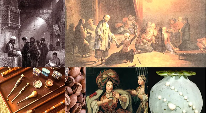 Opium, coffee and tea are all drugs. Many drugs are legal and many are not (alcohol). Paint the paraphernalia of drug use including exquisite opium pipes and opium dens. This is not suggesting you take drugs; on the contrary you should avoid at all costs, and even take coffee and tea in moderation.
